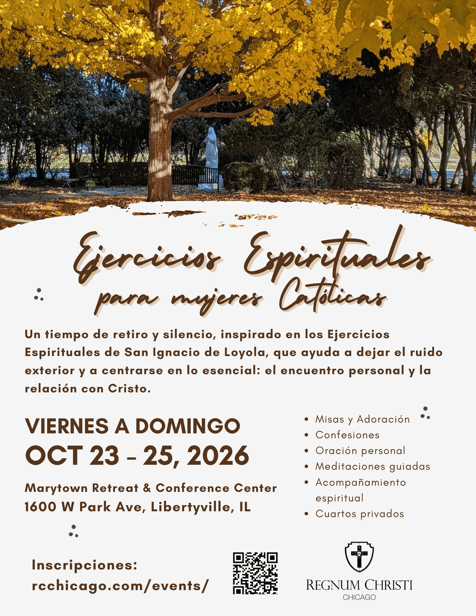 Aléjate del ritmo acelerado de la vida cotidiana para participar en un retiro en silencio basado en los Ejercicios Espirituales de San Ignacio de Loyola. Profundiza tu conocimiento y amor por Jesucristo y descubre la voz de Dios, que anhela hablar a tu corazón, en el entorno tranquilo y hermoso del Centro de Retiros Marytown y Santuario Nacional de San Maximiliano Kolbe.